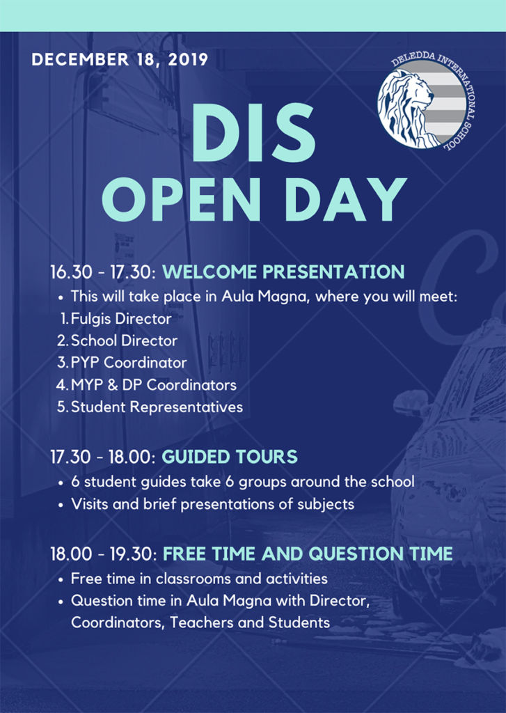 Siete invitati a partecipare all’Open Day presso l’istituto Deledda International School mercoledì 18 dicembre ore 16,30 Aula Magna e giovedì 23 gennaio ore 16,30 Aula Magna, in Corso Mentana 27.